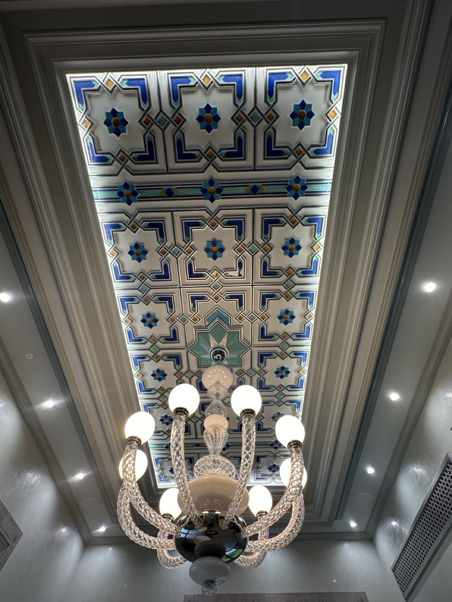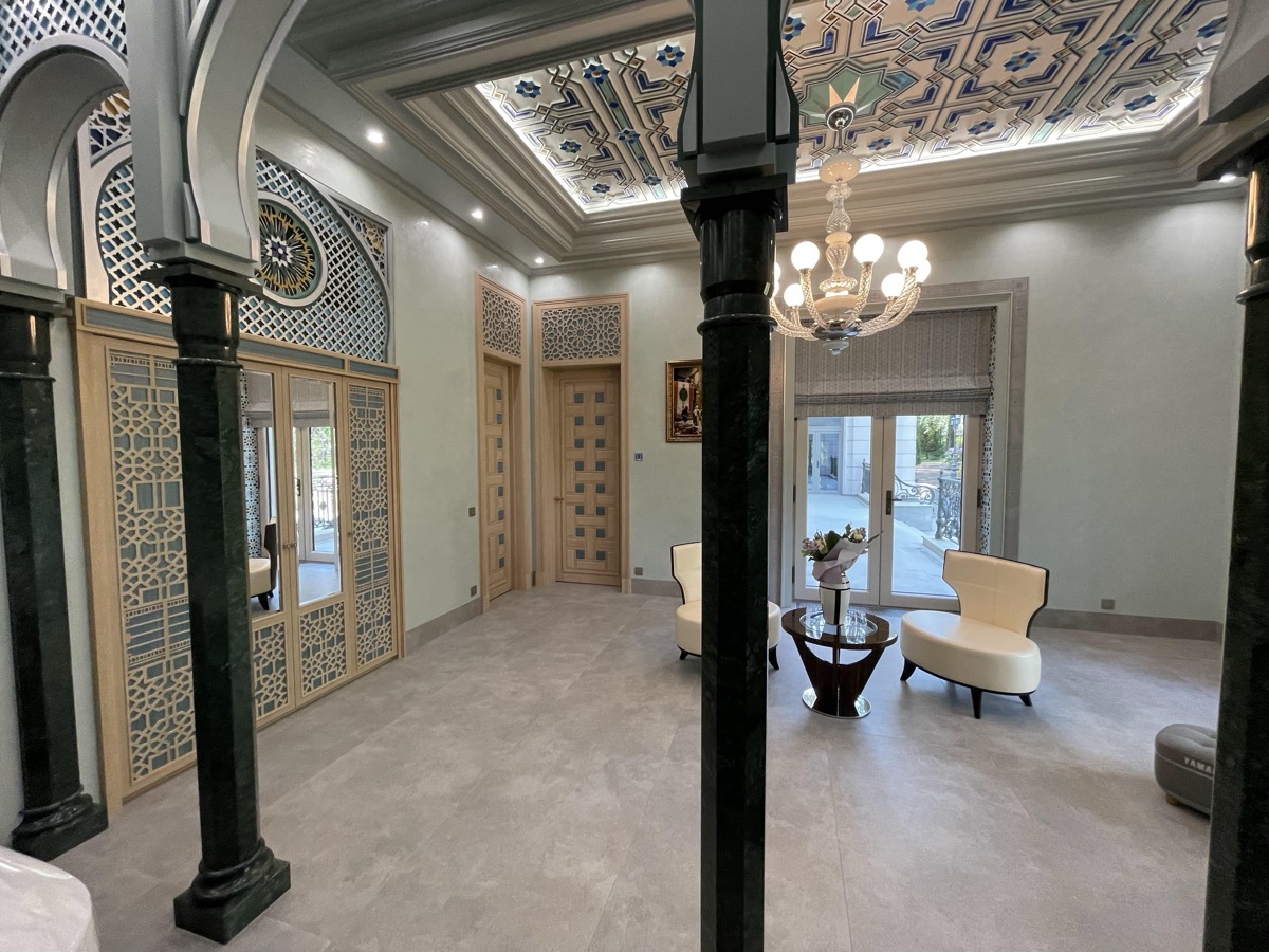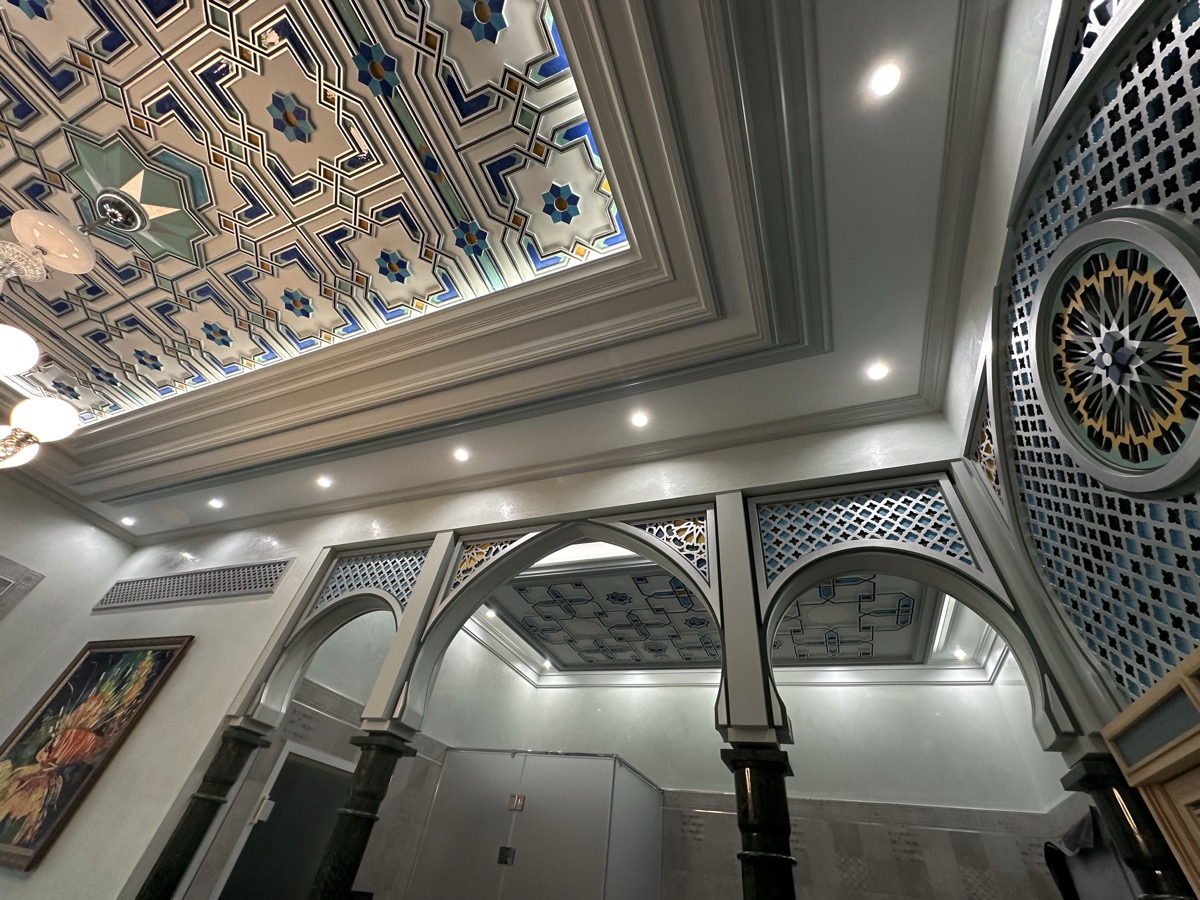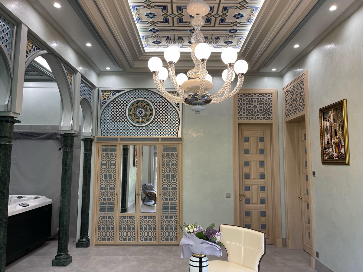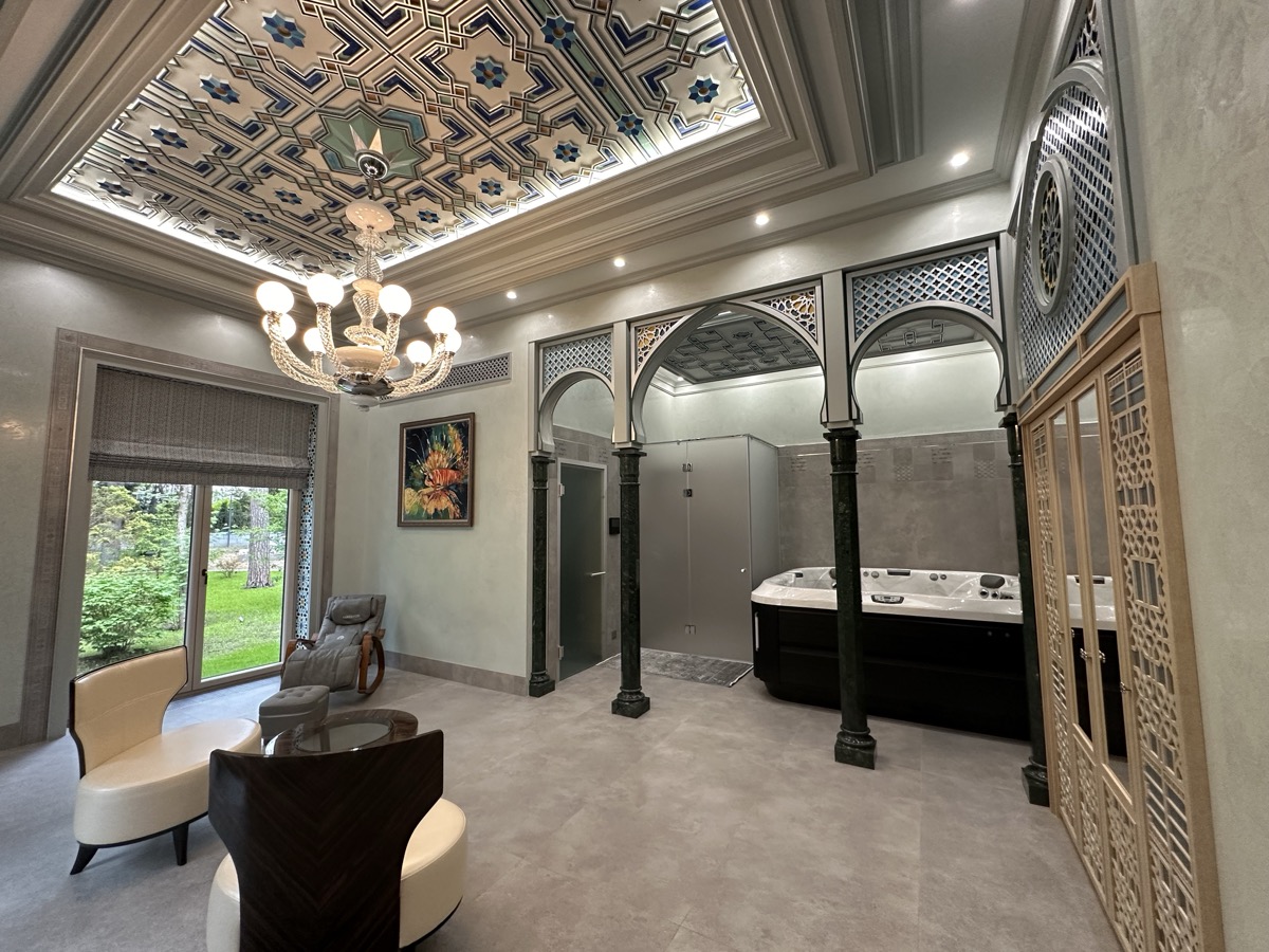 - потолок в спа-зоне выполнен в марокканском стиле, состоит из сочетающихся элементов лепнины и витражного стекла;