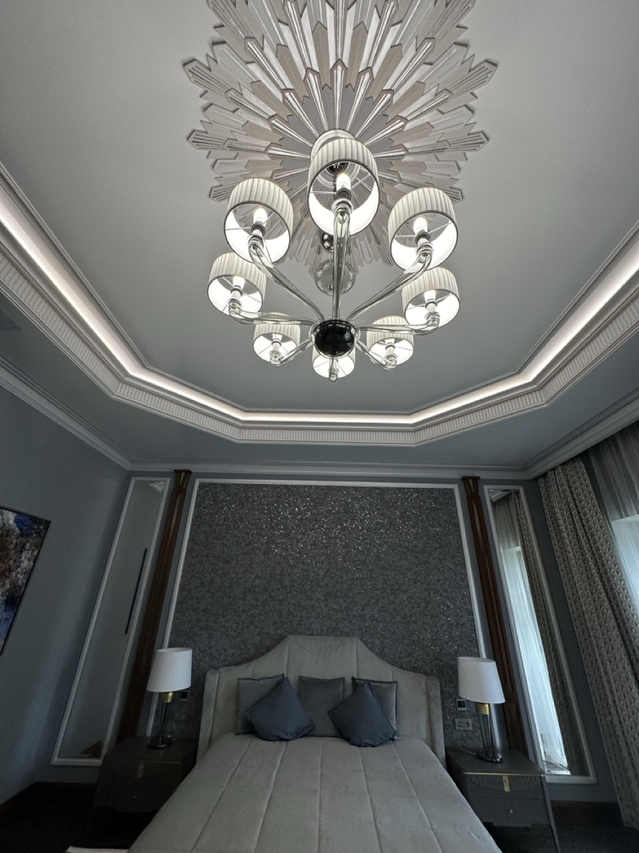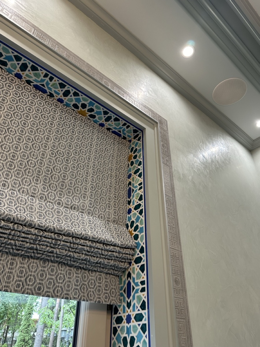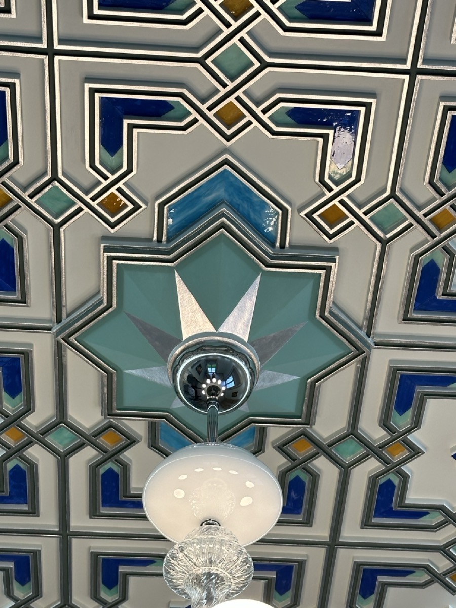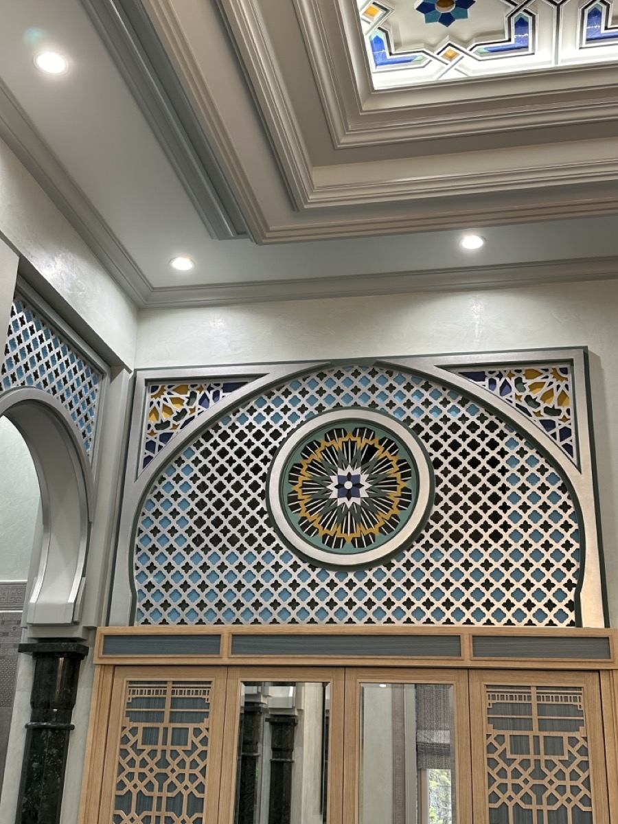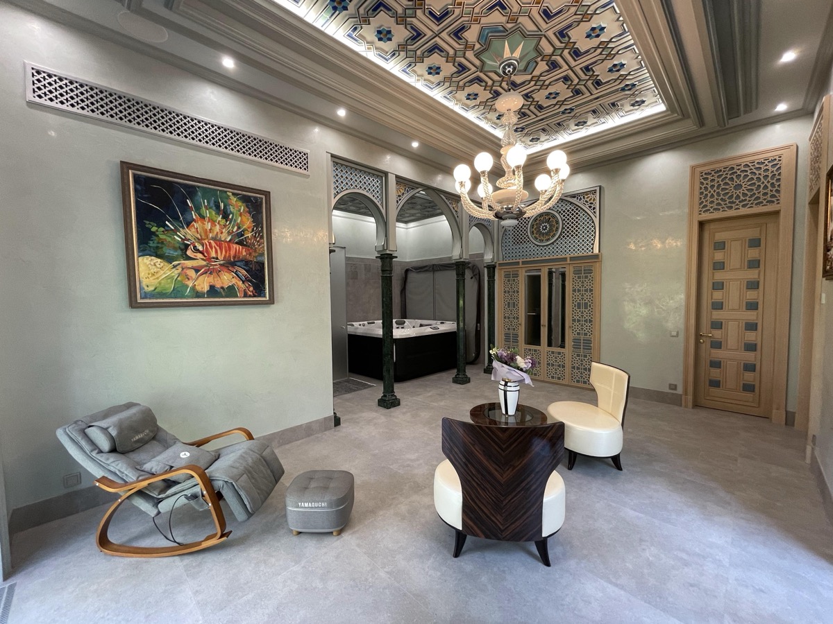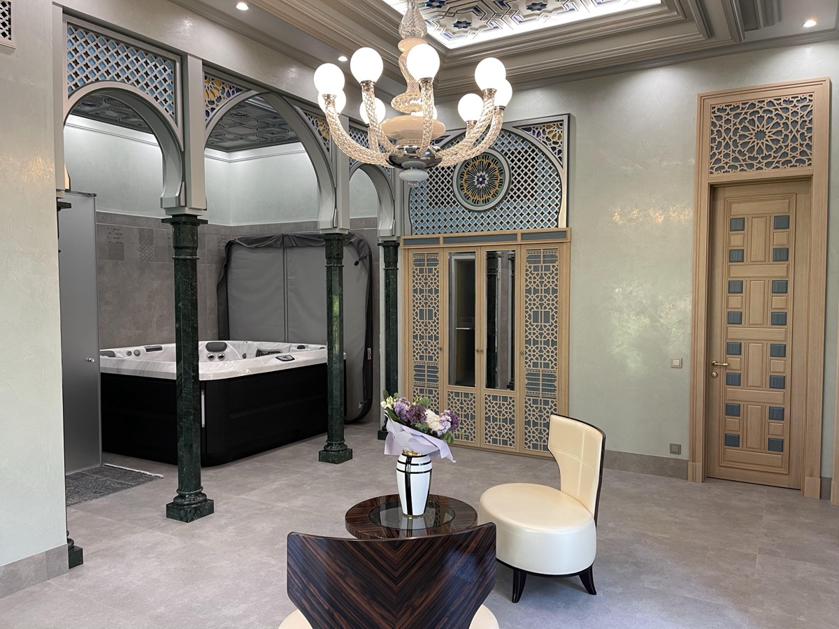 - потолок в спа-зоне выполнен в марокканском стиле, состоит из сочетающихся элементов лепнины и витражного стекла;