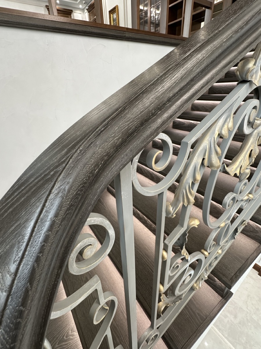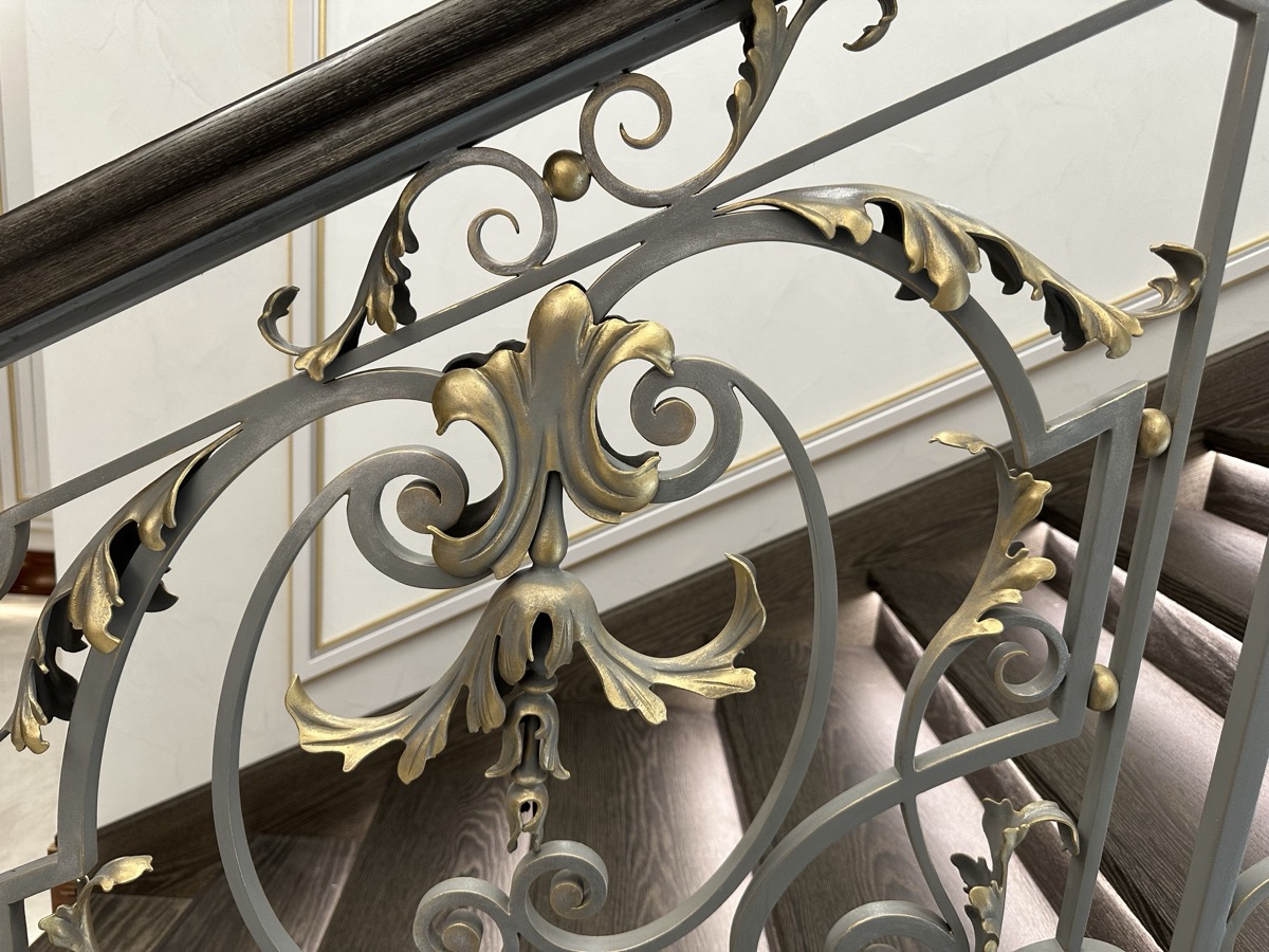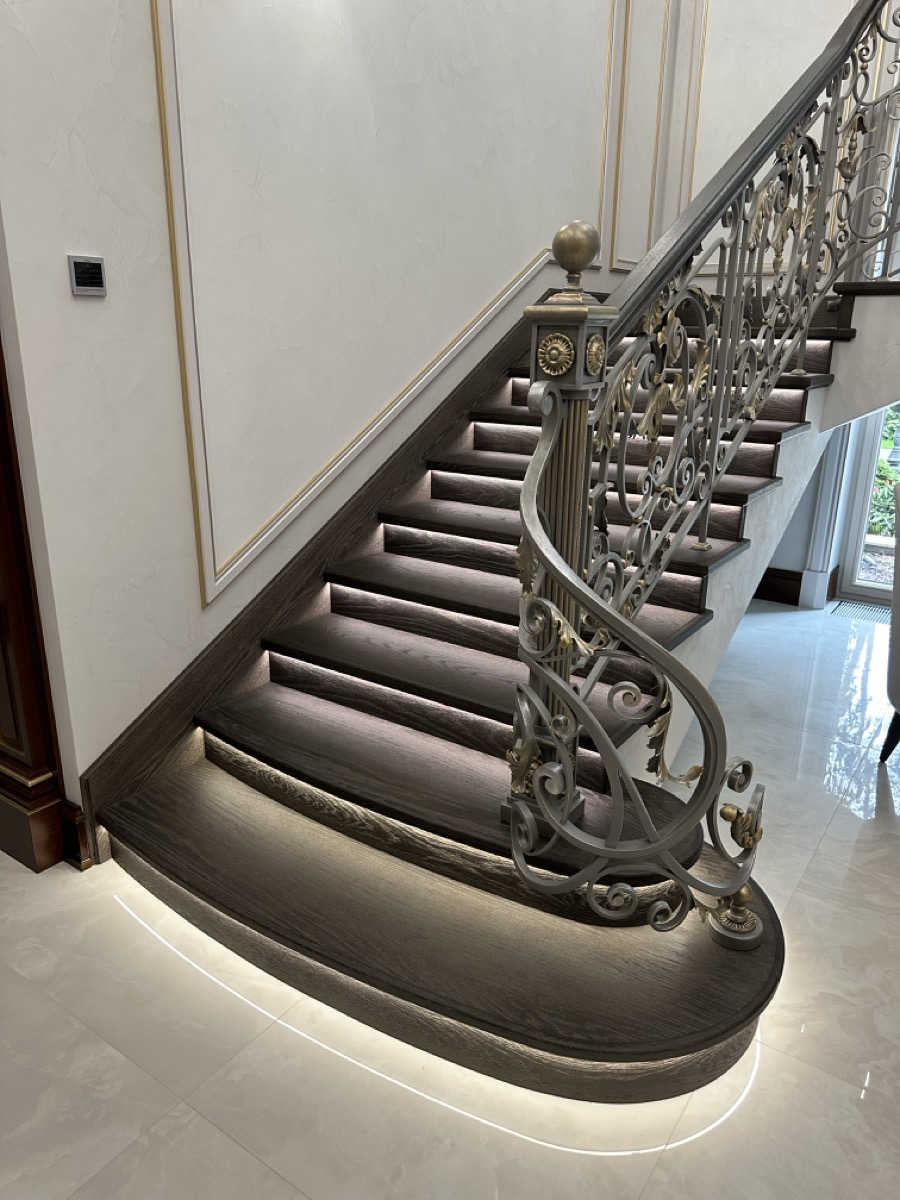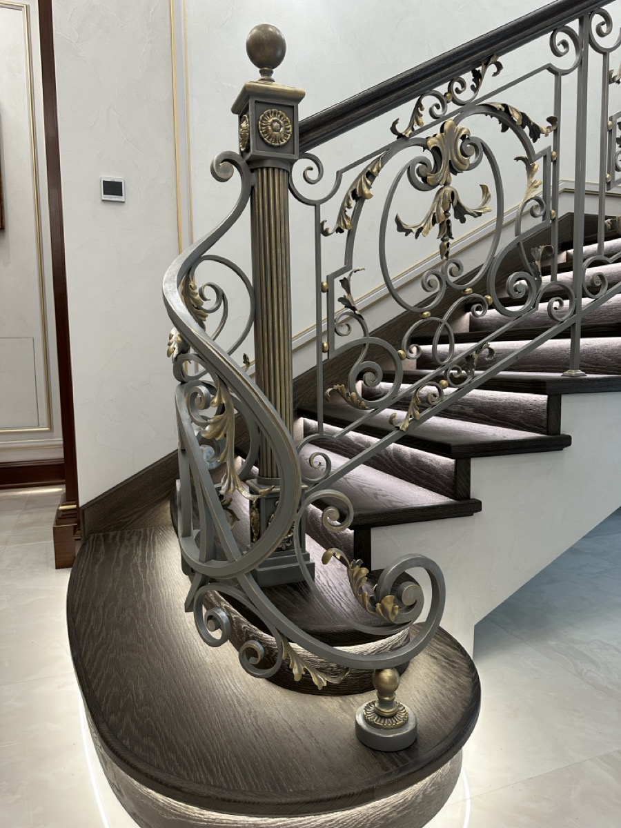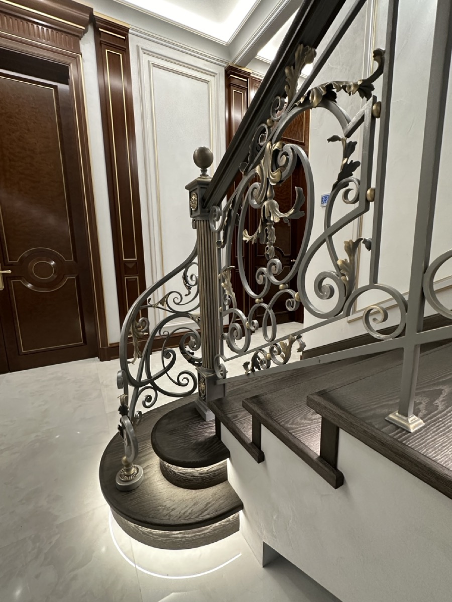 - лестница с деревянными ступенями и кованными ограждениями по индивидуальному проекту.