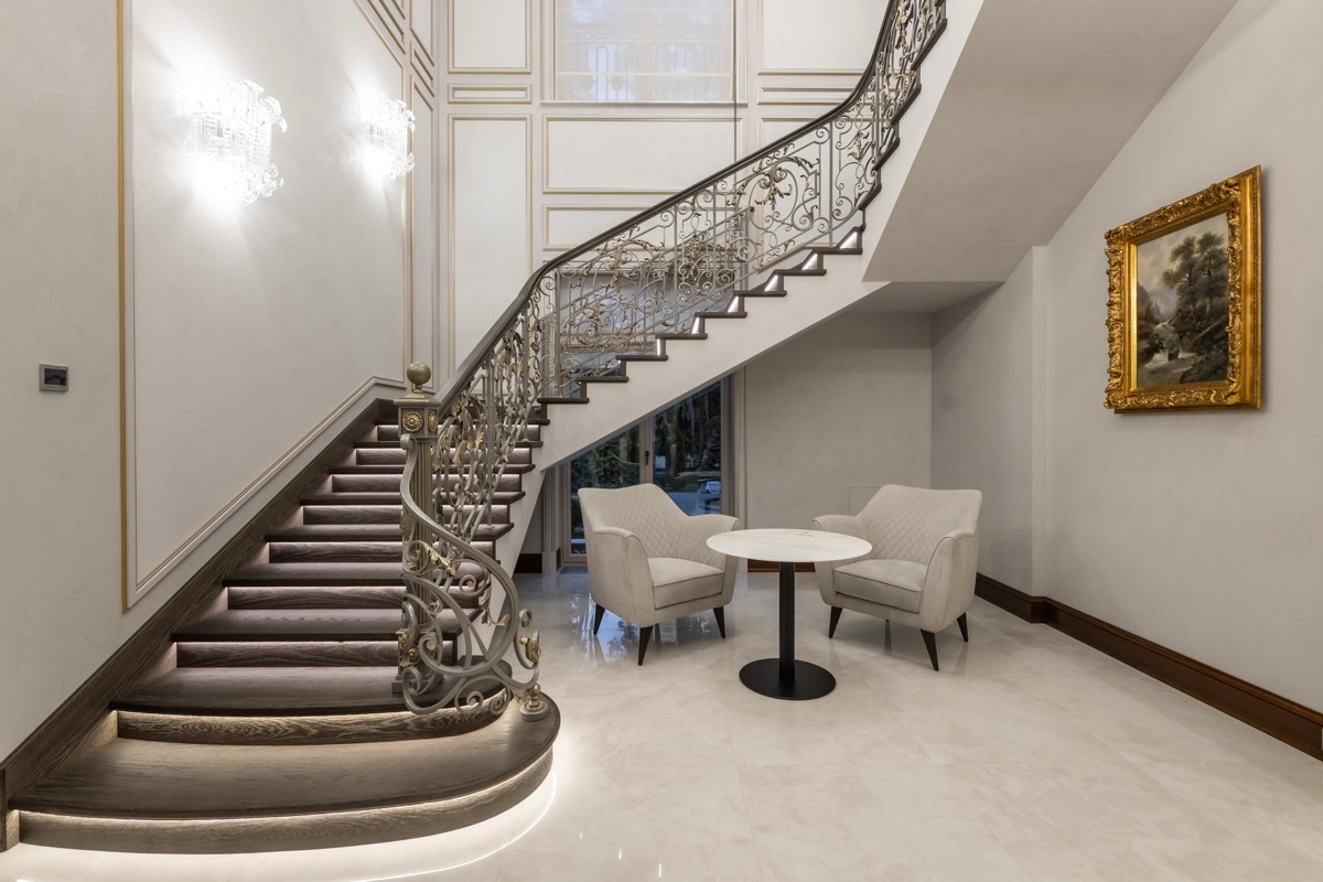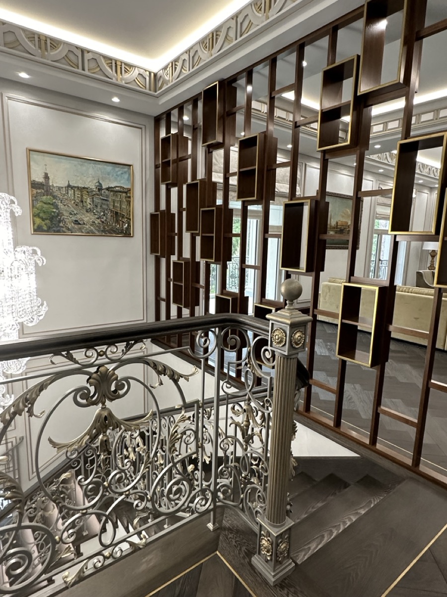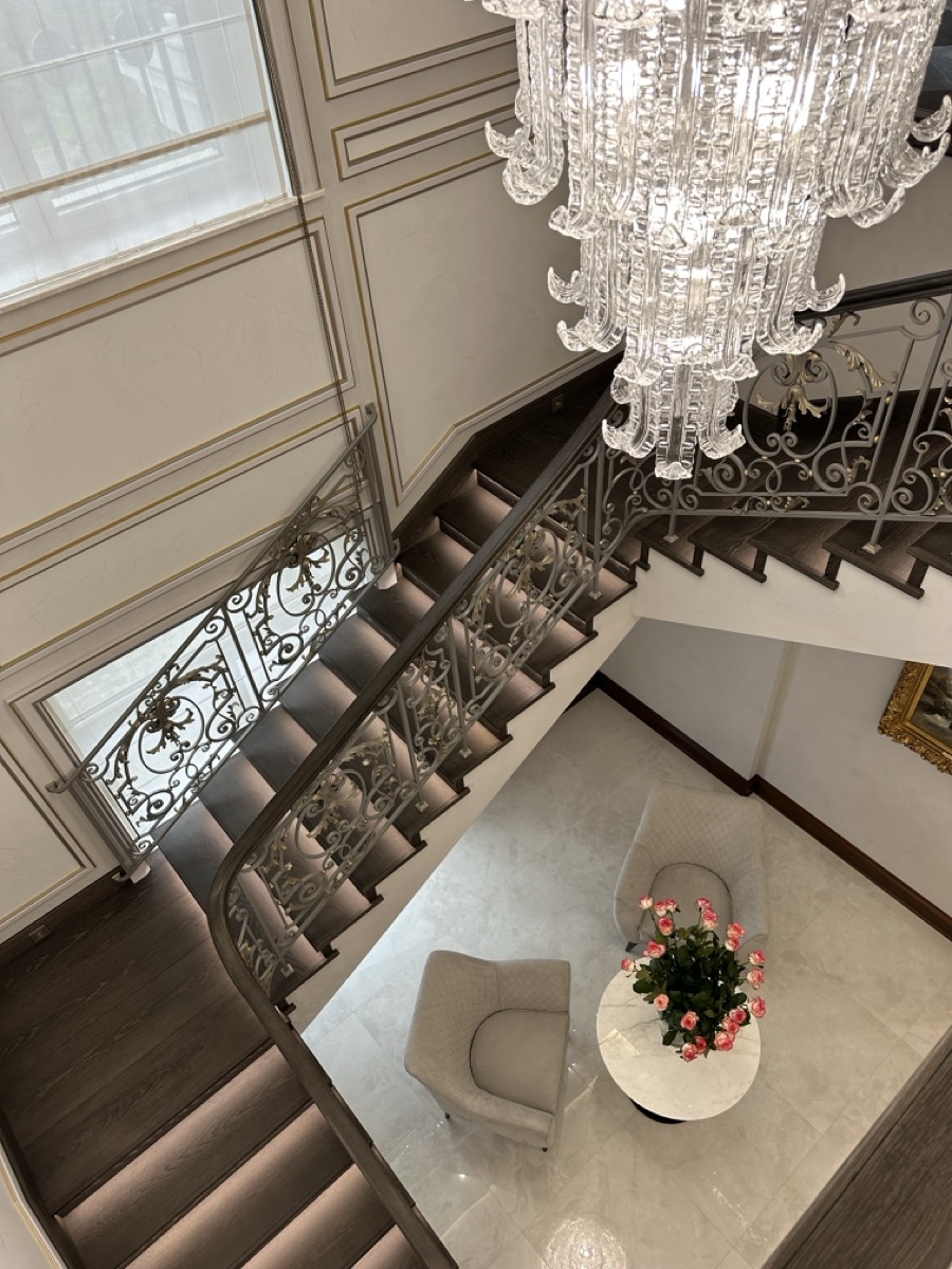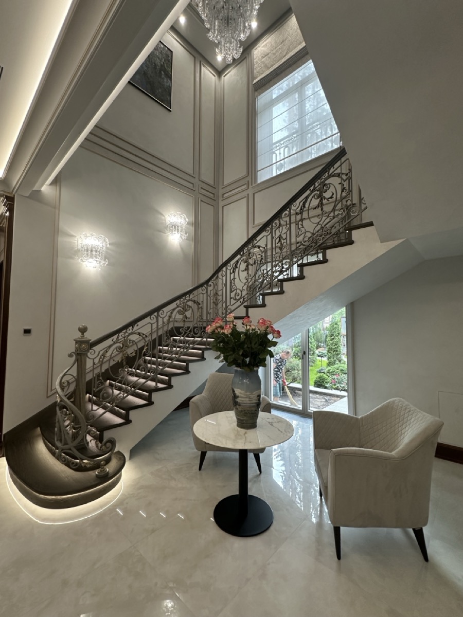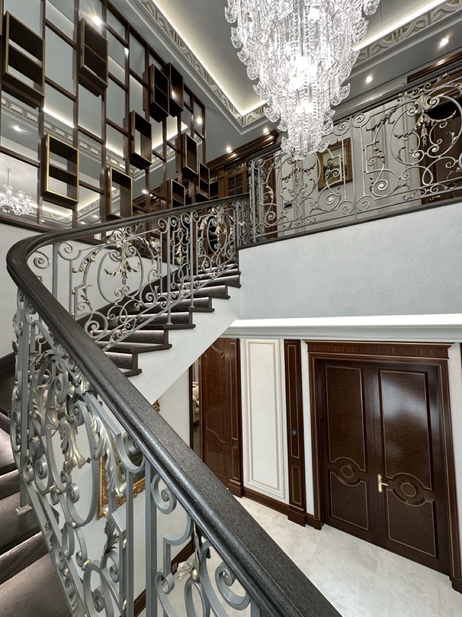 - лестница с деревянными ступенями и кованными ограждениями по индивидуальному проекту.
